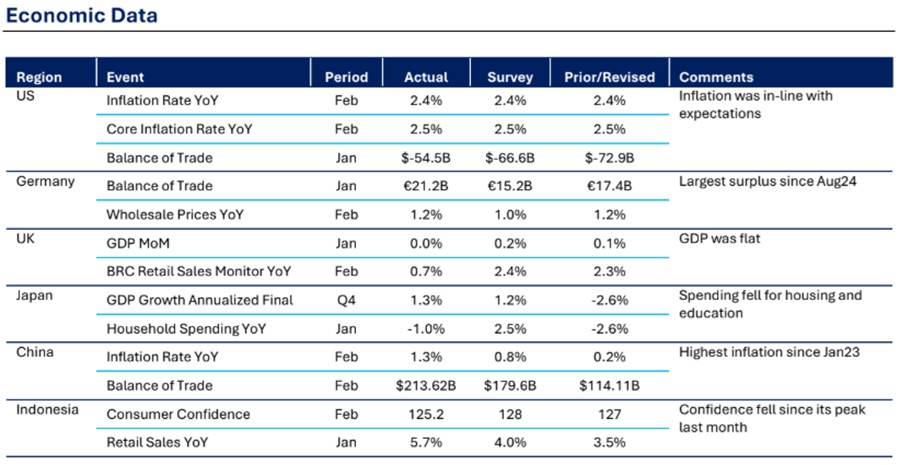 Di China, inflasi tahunan Februari tercatat lebih tinggi dari perkiraan dan mencapai level tertinggi sejak Januari 2023, seiring peningkatan konsumsi selama musim Tahun Baru Imlek. Selain itu, neraca perdagangan juga melampaui ekspektasi dengan surplus yang lebih besar, didorong lonjakan ekspor meskipun impor juga meningkat.