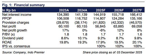 currently trades at 1.7x FY26 P/B and 8.7x P/E (vs. 10Y average of P/B of 2.4x and P/E of 14.7x) which we think may have hit the trough especially with minimal earnings revision.Biggest pushback that we receive is that the bank should trade at lower multiple as micro proportion will continue to decline(to 43-45%in 5 years from 47% average in 2022-2024) and replaced by consumer/corporate with lower ROA/ROE; we believe this partly has been priced-in as current valuation has hit -1 s.d. of its 10Y mean. Catalysts for the stock is pick-up in overall low-end purchasing power which shall help both micro loan growth and asset quality. Risks are lower margin fromdrop in loan yield and sticky CoF; along with worsening asset quality.