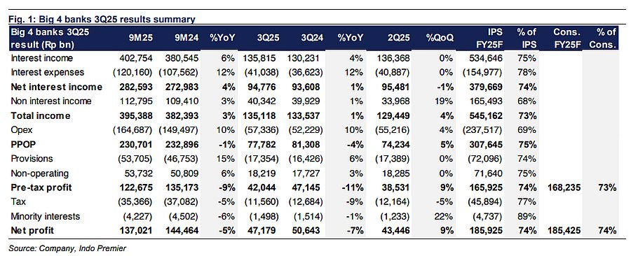 • Big 4 banks net profit of Rp137tr in 9M25 (-5% yoy/+9% qoq in 3Q25) came in-line. On qoq basis, all SOE banks posted significant improvement.