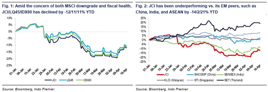 - JCI/LQ45 has dropped by -12/-11% YTD, underperformed its EM peers like China/India/ASEAN peers by -14/-2/-21% YTD.