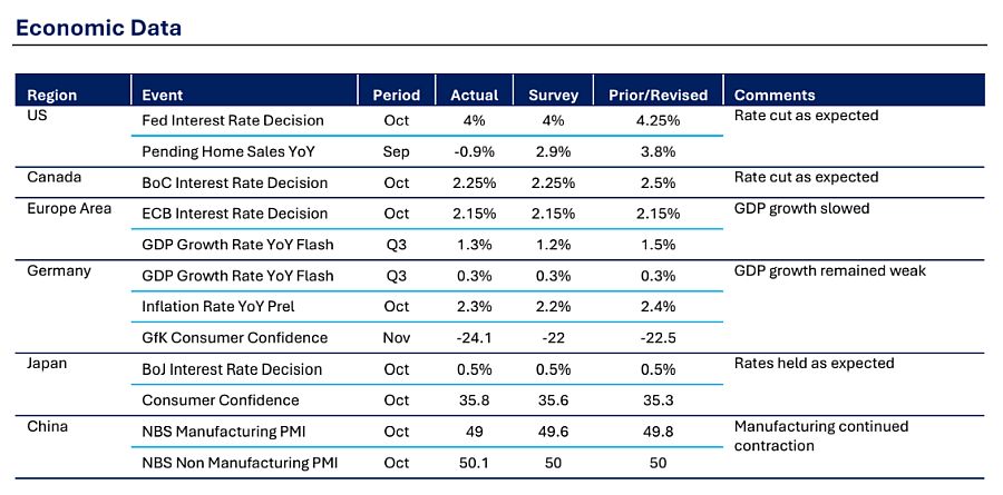 Di Amerika Serikat, penundaan publikasi data ekonomi berlanjut memasuki bulan kedua, berpotensi melampaui government shutdown terpanjang dalam sejarah AS (35 hari). Peristiwa utama pekan ini adalah rapat FOMC , di mana The Fed memangkas suku bunga sesuai ekspektasi pasar. Namun, pernyataan Ketua The Fed Jerome Powell memunculkan ketidakpastian terkait kemungkinan pemangkasan lanjutan pada Desember.