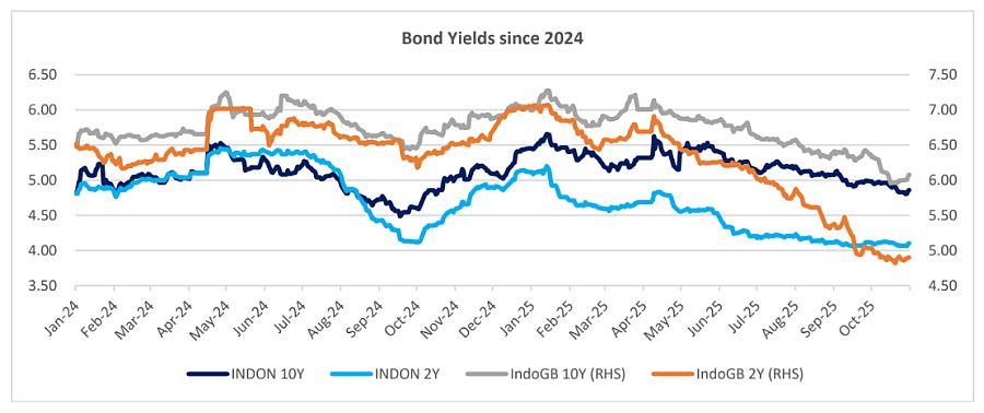 Yield INDON 10 tahun juga sedikit turun ke 4,86%, dan 2 tahun ke 4,10%. "Pergerakan ini lebih mencerminkan reaksi sesaat terhadap nada hawkish, namun kami menilai masih ada faktor positif yang dapat menekan yield lebih rendah ke depan," ungkap Ashmore.