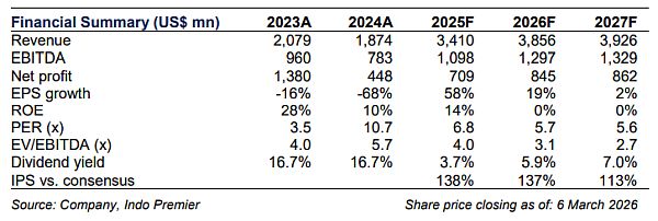 We upgrade our FY26/27F NP estimates by 31/42% to mainly reflect higher coking coal price assumption of US$220/t (from US$200/t previously) and incorporating 's aluminium project into our model. Consequently, we upgrade our SOTP -based TP to Rp3,600/sh (from Rp2,800/sh previously) and reiterate our Buy rating. We continue to believe 's intrinsic value remains underappreciated, with IPS TP excl. green business at Rp3,000/sh. Key downside risks are lower than expected coking coal price, delays in aluminium ramp up or future project expansion, and capex overrun.