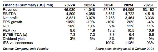 We fine-tuned our FY24F/25F/26F NP forecast by +3%/+1%/+1% to take into account recent development in 3Q24F, c.30% stake purchase & ore offtake agreement. Our TP and Buy rating are kept unchanged given limited change in our NP forecast, is currently trading at 13x FY24F P/E. Downside risks are execution & operational risk from the ore offtake agreement.