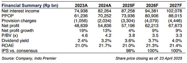 - posted net profit of Rp14.1tr in 1Q25 (+10% yoy), in-line with ours/consensus and supported by solid NII/PPOP growth of +7/10% yoy.