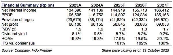 posted 9M25 net profit of Rp40.8tr (-10% yoy/+15% qoq in 3Q25), broadly in-line at 72% of ours/consensus FY25F. PPOP slipped -1% yoy from weaker non-II (-2% yoy - due to weak recovery at -14.4% yoy) while NII was modest (+3% yoy). Opex grew at +5% yoy, translating to steady CIR of 43% (vs. 42%/41% in 2Q25/3Q24). Provisions rose +14% yoy but eased -6% qoq, bringing CoC lower to 3.2% (vs. 3.4% in 2Q25/3Q24), trending back towards management's 3.0-3.2% guidance.