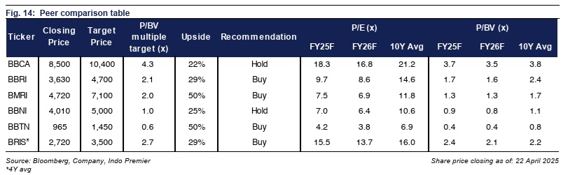 We observed that overall foreign holding in big 4 banks have fallen to 59.1% from 59.9% at FY23 (peak) with leading the way at -480bp drop from FY23 peak. was the most resilient with -30bp YTD drop from its peak. This was expected given the flurry of overhangs i.e. tariffs, formation of Danantara, management changes, weak Jan25 results.