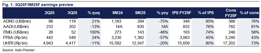Kami memperkirakan tren laba bersih (NP) emiten batu bara di 3Q25F akan bervariasi. dan mencatatkan peningkatan laba bersih kuartalan signifikan (+21%/+100% qoq) terutama karena kenaikan harga/volume penjualan Newcastle (+9%/+17% qoq) untuk , serta berkurangnya kerugian asosiasi dari BPI untuk (laba inti: +7% qoq).