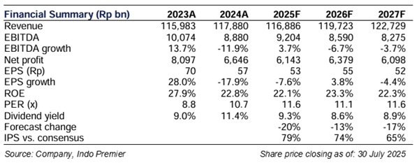 - membukukan laba bersih 1H25 sebesar Rp2,1tr (-36% yoy), di bawah estimasi kami/konsensus sebesar 26%/28% vs. rata-rata 5 tahun sebesar 52%.