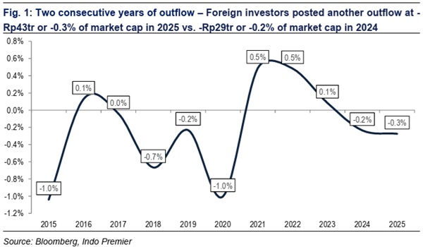 Foreign has booked -Rp43tr outflow in JCI (-Rp46tr in IDX80) in 2025 and continuation post -Rp29tr outflow in 2024 (-37.3tr in IDX80) - this represents -0.3/-0.2% of market cap in 2025/24. This was similar to 2018-2020 period where foreign booked a total -Rp123tr of outflow (-Rp61/17/46tr in 2020/19/18 or -1.0/-0.2/-0.7% of market cap). We believe the outflow in 2025 was expected as JCI booked -7% EPS growth (our coverage at -3% yoy) along with the change in political landscape. However, the outflow continues YTD with -Rp17.3tr, with banks remained the biggest source of outflow especially at -Rp15.9tr YTD (-Rp28.8tr in 2025) amidst non-fundamental concern and was exacerbated by recent event on Martabe (); this was despite 's strong fundamental.