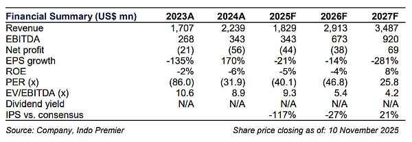 Combined with 's EBITDA improvement (report), we estimate to report US$145mn EBITDA in 3Q25 (+64% qoq) or around US$323mn EBITDA in 9M25, higher than ours/consensus forecast (94% IPS/74% consensus). We maintain our NP/EBITDA estimates for now and maintain our Buy rating. Our TP of Rp3,000/share is kept unchanged. Key catalysts include +ve progress on TB copper project, higher gold price environment driven by concern over Fed independence, and aggressive China stimulus.