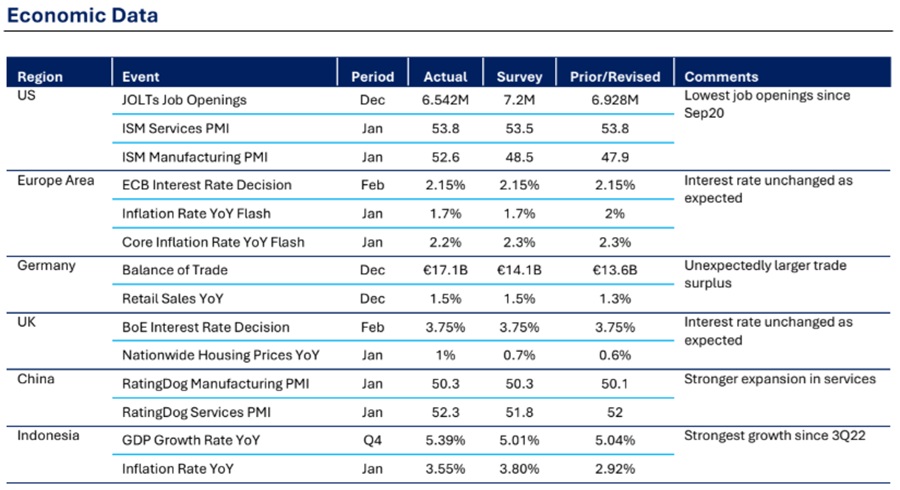 Sementara itu di Asia, rilis PMI manufaktur China sejalan dengan ekspektasi dengan ekspansi ringan dan menunjukkan tren kenaikan stabil sejak November. Namun, PMI jasa meningkat lebih tinggi dari perkiraan, didorong pertumbuhan bisnis baru.