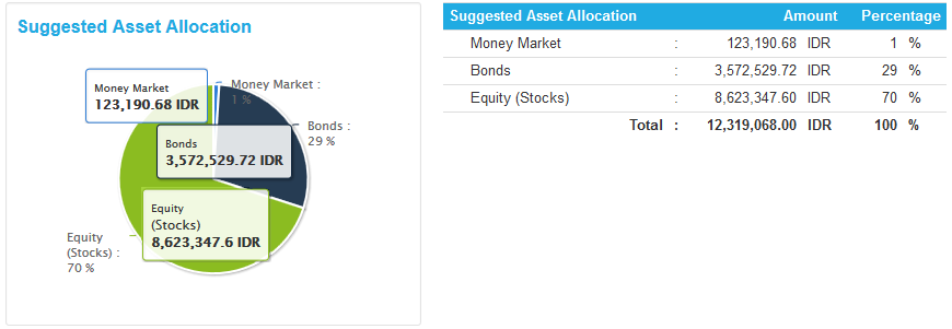 “Don't put all your eggs in one basket”!! Dalam mengelola keuangan kita sangat perlu merancang jenis investasi yang beragam. Jangan taruh seluruh investasi Anda dalam satu (1) jenis investasi saja. Karena jika terjadi guncangan pada keranjang tersebut, semua telur akan pecah dan tak bernilai. Dengan kata lain, Anda akan kehilangan investasi tersebut jika hanya menaruhnya pada satu jenis investasi. Bayangkan jika Anda menyebarkannya, Anda akan masih memiliki jenis investasi yang lainnya untuk meminimalisir segala kerugian yang mungkin terjadi. IPOT-PLAN mencoba memberikan gambaran Alokasi Aset yang Disarankan sesuai dengan prinsip perencanaan keuangan.